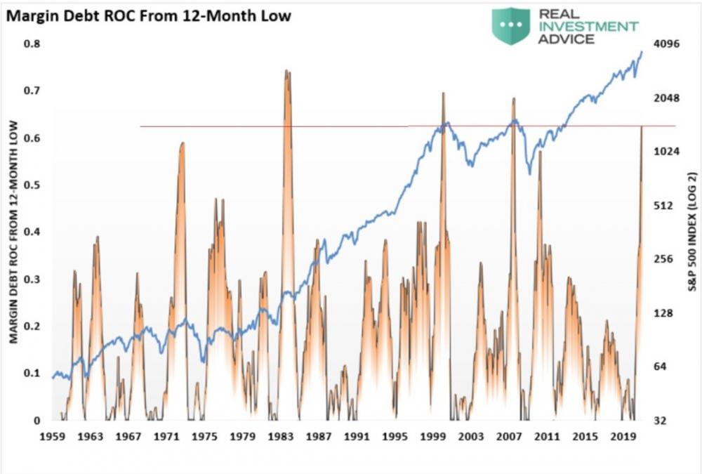 The following chart shows changes in margin debt since 1959, measured from each yearly low point. |