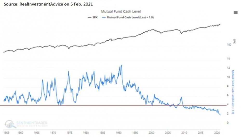 | As you can see, between 1995 and 2005, mutual funds never had cash reserves of less than 4%. After the financial crisis, these fund managers got bolder.