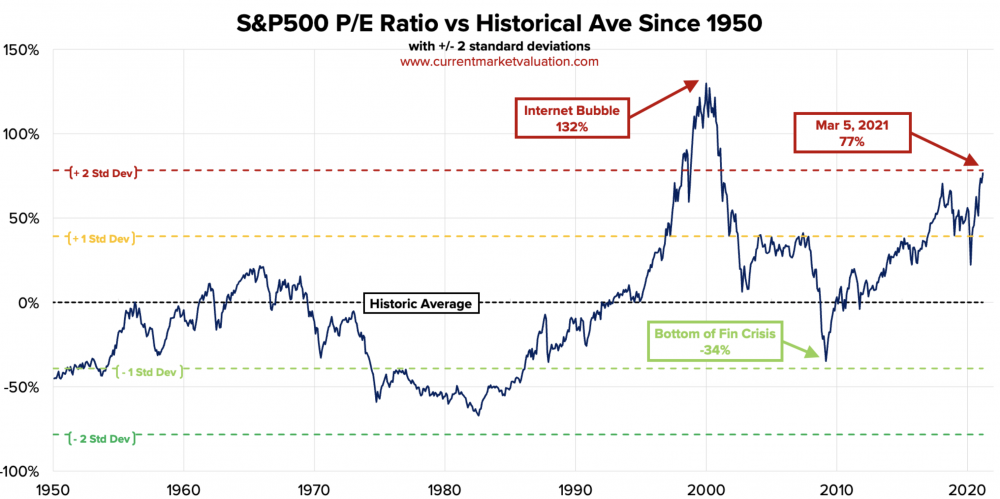 The answer is everything. But as you can see, the Internet Bubble of 2000 brought about a 132% difference between the S&P 500 P/E Ratio and the historical average to 1950. And… it came over a three-year period.