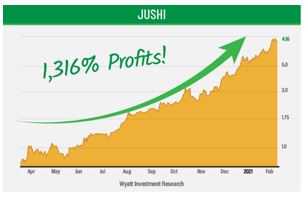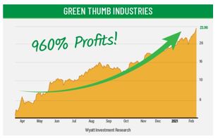 | American pot stocks are soaring… With U.S. marijuana sales to be 12 times higher than Canada's by 2024! Three pot stocks are on the verge of riding this marijuana boom for HUGE profits. Click here ASAP for urgent details. In the last year, we've seen pot stocks like Green Thumb Industries go up 960%… Terrascend soar by 1,266%… And Jushi skyrocket 1,316%! Many other marijuana companies have profited handsomely from this industry boom… But three little-known pot stocks could be next on the list of massive triple-digit winners. Two of them are already being traded publicly… And one of them is a PRE-IPO company — that ANYONE can invest in with ZERO restrictions! Get the urgent details on this powerful pot stock here. Ian Wyatt P.S. These three companies could be acquired for a huge premium. And whenever that's happened before with pot companies, share prices have gone to the moon! Click here NOW for details before you miss the buyouts! Disclaimer & Important Information Terms of Use | Privacy Policy This is a communication from Wyatt Investment Research. You are subscribed with the following email address: diansastroxz.forex@blogger.com If you believe this communication to be a mistake, please e-mail abuse@wyattresearchnewsletters.com with details regarding your situation, and we will be sure to promptly investigate your situation. Wyatt Investment Research |
