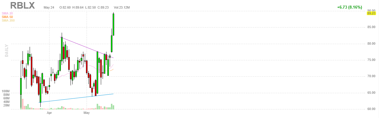 One prominent trader bought 2500 RBLX June $110 Calls for $1.85. That is a $463K bet that RBLX continues this run.