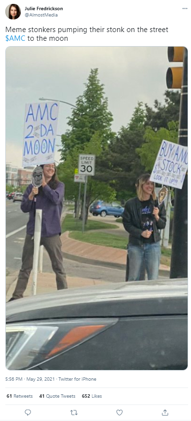 Meanwhile, the company is really leaning into this short squeeze bubble... AMC CEO Adam Aron has been cheekily engaging AMC's self-described apes for weeks now on Twitter. Consider these meme tweets from May 12... Source: Twitter/CEOAdam AMC took its explicit flirtation with retail investors to a whole other level this morning when it announced the launch of "AMC Investor Connect," which "allows AMC shareholders to self-identify through the AMC website and receive important AMC special offers and Company updates." In the press release, the company noted that "more than 3.2 million individual investors owned a stake in AMC as of March 11, 2021" and that retail investors comprised more than 80% of the ownership of the Company as of that date. While I know tons of brilliant and wildly successful individual investors, 80% retail ownership is not normal, and it's a red flag... especially for a mid-cap company like AMC. I don't believe that institutional investors have flooded into the stock at these higher levels, except those playing the squeeze. These institutions would be traders – not long-term investors – attempting to ride the coattails of the retail-driven explosion in the shares, confident that they will be able to front run retail on the way out. Simply put... if retail made up 80% of holders on March 11, I don't think that number is likely much lower today. Investors who sign up for AMC Investor Connect are going to get an initial offer of a free large popcorn at the theater. From my memory, that overpriced popcorn would set you back around $8 in New York City... I'm sure it costs less in other markets. But even at $5 for a large bucket, that free gift with purchase of a share of stock may actually prove worth more than the share itself, with a long enough time horizon. So, what should investors do about AMC shares? A couple of friends contacted me this week asking this very question. There's no good answer for this. These shares shouldn't trade at $60 and they shouldn't even trade at $20, where they changed hands this time last week. There's no realistic justification for this valuation... It's all about supply and demand imbalances, which are almost by definition temporary... but often seem to last just until people can't bear to stay short anymore. As I told my friends, AMC is at best worth in the single digits... It might even yet be a bagel, that is, headed to zero in a future bankruptcy. But could AMC shares go to $100 first? Sure, why not. They are already disconnected from reality. Once trading in fantasy land... why not $100? Why not $1,000? None of the "diamond hands" crowd is pulling out a calculator to figure out the share price based on a projection of 2024 EBITDA and applying a chosen enterprise multiple to that. It's just the latest rocket ship. And the loyalty – at least for now – of the AMC "ape squad" is apparent, with banners touting the stock flying over Chicago... Source: Twitter/Jingalbellz And marchers taking to the streets in Boulder, Colorado... Source: Twitter/AlmostMedia To be honest, I've never seen anything like this in my nearly 30-year career in the markets. To me, with the banners and signs, we have officially crossed over into "weirder than GameStop" terrain. While professional investors might want to wade into the treacherous waters of betting on a fall in AMC, I would recommend that non-pros just stay away. As I told a friend, "AMC stock is a slot machine now." If you chose to go long AMC shares, recognize that you're gambling, not investing. And if you choose to go short, recognize that this may end up a case of "the market can stay irrational longer than you can stay solvent." In the mailbag, more on Amazon's purchase of the MGM studio and readers were very clear about who their favorite James Bond is... Has anyone out there had any luck playing AMC – or any of the other "meme stocks" – either long or short? Who do you think is actually paying for the banners that have flown over Chicago and New York... Do you think it's really retail investors, or are hedge funds piling in? Do you agree with me that movie theater attendance is likely to settle out permanently lower long after any risk from COVID-19 has passed? Share your thoughts in an e-mail to feedback@empirefinancialresearch.com. "Berna, I am with you that I view video as a bonus [with Amazon Prime]. I would not cancel Prime if they got rid of their streaming service. "As far as the Amazon Studio, John Malone said in a CNBC interview a few years ago that he thinks Amazon's end game with Amazon Prime Video is likely to be a platform rather than a content owner. I think what he said makes a lot of sense. However, I think that has proved difficult in a world of Dispersion (as coined by Professor Scott Galloway), where everyone is vying to go direct to consumer through streaming. "Amazon has to produce their own content until some of these other businesses lose out in the DTC game (because nobody is going to want 10 different $7-12/month content subscriptions). At that point, Amazon can position itself to start picking them off and gaining their content and/or placing them on their platform like they've done in the past with CBS, PBS, and Cinemax. Eventually, maybe they are what the Apple Store is for music, but they have to keep producing content if they want anything meaningful to distribute until their opportunity arises. "Good and thought-provoking article as usual! Thanks for everything!" – Greg S. "Your only question of 'importance' is who is your favorite James Bond? Easy – Shawn Connery – may he live forever in the role." – Ramona R. "Sneaking into a theatre with my cousin when we were ten to watch a double header of Thunder Ball and You Only Live Twice places my first place vote with Sean Connery. Daniel Craig is a close second." – Rich F. "James Bond SEAN CONNERY !!!!!!!!!!!!!!" – M.K. "Sean Connery the first James Bond and Rodger Smith, best dressed and groomed 