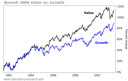 It's the Best Time in Nearly 100 Years for One of My Favorite TradesBy Dan Ferris If you're an optimist at heart, you'll love today's essay... Today, I'll recommend a trade that I've liked off and on for the past couple of years. This trade has already performed well since last fall... And right now, it's more attractive than it has been at any time in history – going back to at least 1928. But before I give away all the specifics, we must learn about different types of stocks... As you likely know, the stock market can be split many different ways... You can divide stocks into different groups by market cap, specific sector, current momentum, and much more. And as a dyed-in-the-wool value investor, one particular split always catches my attention – two broad groups of value stocks and growth stocks. Value-stock indexes generally contain the cheapest stocks (above a certain market cap) based on simple metrics like the ratios of price to book value, price to earnings, and price to cash flow. On the other hand, growth-stock indexes generally contain companies whose revenues are growing faster than the rest of the market at any given time. The fact that some pairs of value and growth indexes contain some of the same stocks is a topic for another day. But just know this today... Any overlap doesn't stop the indexes from performing differently – sometimes very differently – for many years at a time. What do I mean by differently? Well, over the past few decades, when growth stocks have performed well, value stocks have tended not to perform as well... and vice versa. I call it the "tick tock" of stock market history because it resembles the swing of a pendulum in a big grandfather clock. The pendulum swings toward value stocks for a while... then back toward growth stocks... then back toward value... then growth... then value... etc. If you're wondering why this happens, it's just a function of human nature... People tend to get excited about one group of stocks, then they get bored and switch to another group. Generally speaking, value stocks are seen as stodgy and conservative. So when investors are super optimistic and excited about speculating on new technologies and other growth stocks, they tend to leave the stodgier, more conservative stuff behind. (Oil and financial stocks are two good examples of the stodgier, value-type stocks today.) And when investors then feel like they've gotten burned by believing too deeply that a "new era" was dawning due to recent technologies, they turn back to the stodgy, conservative, old value stocks. Now, let's look at how value and growth stocks have exchanged market roles over the past two decades... We'll use the Russell 3000 Value and Growth Indexes to track the two groups of stocks. And we'll start with the most recent period, then go backward in time to the start of the 21st century. Since the bottom of the financial crisis in March 2009, growth stocks have outperformed value stocks. From March 1, 2009, through today, the Russell 3000 Growth Index is up roughly 656%, while the Russell 3000 Value Index has risen only about 277%... To understand why investors turned to growth stocks when they did, try to remember what was happening back in 2009... All stocks were down as fear and uncertainty reigned. But the worst performers were the banks, homebuilders, subprime mortgage lenders (all stodgier, value-type businesses)... and any other business tied directly to the housing bubble. That's because when the housing bubble burst, investors lost huge amounts of money and soured on those sectors. More than 100 banks failed in the bust – including large ones like Wall Street stalwart Lehman Brothers and savings and loan Washington Mutual. Home prices kept falling and didn't bottom until 2012, scaring investors away from any businesses connected to housing. When investors turned away from banks, homebuilders, and other value stocks, they sought opportunities elsewhere... They turned back to technology and other growth-related stocks. Of course, right now, you might be wondering why investors abandoned growth stocks to begin with. To answer that question and understand why value dominated in the run-up to the housing bubble peak, we must go back to late 2002 – the bottom of the dot-com bust. And as you can see in the following chart, value stocks trumped growth stocks in the aftermath of that bust. From the bottom of the dot-com crash in October 2002 until the peak of the housing bubble in October 2007, the Russell 3000 Value Index rose 112%, compared with a 90% gain in the Russell 3000 Growth Index over the same period... After technology, telecommunications, Internet, and other growth stocks crashed at the end of the dot-com bust, the Federal Reserve lowered interest rates. Lower interest rates meant lower mortgage payments... That made buying houses more feasible for many Americans. Investors felt burned by the popping of the Internet bubble. Even a cash-gushing, stalwart business like router and switch maker Cisco (CSCO) fell nearly 90% from peak to trough. Folks were fed up with losing money... so they switched to stodgier fare – like the then-cheaper homebuilders, banks, mining companies, and other similar stocks that had been neglected during the dot-com bubble. They also started to invest directly in houses... and TV shows about house flipping began to appear. That's really all the history we need... When the dot-com bubble blew up, investors switched from growth to value. Then, they switched back to growth after the housing bubble popped and triggered the Great Financial Crisis. And for the past decade-plus since then, growth stocks have been in charge. Growth... value... growth. You can guess what comes next.