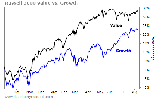 And even better, it looks like the latest transition from growth to value is well underway... Investors remained in love with growth stocks as the COVID-induced bear market of March 2020 passed and the rebound began. The Russell 3000 Growth Index rose 75% from its bottom on March 23, 2020, through the end of August, while the Value Index climbed 44%... But by September, the "stay at home" trade in fast-growing technology companies had largely played out. Talk of inflation began to pick up around this time... That's generally thought to be bullish for some of the more traditional value-stock industries – like oil companies (which might benefit from higher oil prices) and banks (which might benefit from larger interest-rate spreads). While growth stocks had outperformed their value counterparts most of the time since 2009, a potentially big change started happening at that point... Value took charge again. Take a look at the following chart... Since September 1, 2020, the Russell 3000 Value Index is up 34%. In comparison, the Growth Index has only climbed 22% over the same period. According to my friend Jason Goepfert at SentimenTrader.com, the correlation between value and growth stocks has never been lower going back to 1928. That means investors have never cared about the difference between value and growth more than right now. So right around the time that value is taking a breather for a few weeks and letting growth stocks catch up a little bit... value has never been more attractive compared with growth – going back nearly 100 years. In other words, the combination of a one-month dip in value's recent outperformance over growth and the biggest difference in investors' appetite between the two groups of stocks looks like the perfect moment to go long value stocks if you haven't already. So after more than a decade of you being told to buy every dip in growth stocks, in today's essay, I'd like to be the first person to tell you to buy the dip in value stocks right now! Now, you might be wondering exactly how to execute this trade... It's easy... A bunch of publicly traded exchange-traded funds ("ETFs") exist for this purpose. The Vanguard Value Index Fund (VTV) is the biggest value-focused ETF that I know... It tracks the CRSP U.S. Large Cap Value Index, which as its name implies, measures the return of hundreds of U.S. large-cap value stocks. VTV's roughly 335 holdings include Berkshire Hathaway (BRK-B), the ETF's largest position, and ExxonMobil (XOM), which is a top 10 position. As of the end of May, financial stocks made up roughly 22% of the ETF's total holdings. And it's a Vanguard fund, so the expense ratio is microscopic (0.04%). It's large and liquid. And even better, it has performed similarly to the Russell 3000 Value Index... so it should work well for investors seeking to buy the recent dip in value stocks. (Full disclosure: I currently own a value-focused ETF in my 401(k) account. It's not the one that I've mentioned today... But I don't want to get in trouble with any lawyers.) How much will you make if you make this trade today? I can't possibly know that... But it's a good bet that you'll make more than you would by holding all the stocks that have been "no brainers" for more than a decade. Nothing outperforms forever. And the sun appears to be setting on the growth-stock hyper-bull market. By going long value stocks right now, I'm trying to reduce risk by buying stocks that are out of favor and have generally performed well for the past 10 months. And let's get this straight... Right now, almost nothing in the stock market is out of favor on an absolute basis. Nothing is absolutely cheap. The best thing you can find today is a stock (or group of stocks) that's relatively cheap in comparison with other stocks. That's exactly what this trade is... Value is cheap relative to growth these days, and it's more out of favor relative to growth than it has been in nearly 100 years. So it has excellent potential to become a great long-term trade. Even during my most bearish phases, I've always advocated against selling stocks in an attempt to avoid a bear market... That sort of timing is a fool's errand. I've always recommended continuing to hold your equities... That's because human progress is relentless – and you simply can't afford not to have a stake in it. Plus, as I always say, when you find a good business trading at a reasonable enough price, you should buy it... It doesn't matter if you think the overall market is expensive or not. You can't afford not to be a long-term equity holder. That's how the big money is made in equities – by buying right and sitting tight. You can buy a value ETF right now. Relative to the growth stocks everyone has been in love with for more than a decade, value is more attractive than it has been in nearly 100 years. The late stages of a huge bull market – like what we're living through right now – are a great time to put on contrarian trades... And buying a value ETF is perhaps the least risky contrarian trade you can make today. Plus, with interest rates making most bonds unattractive and the equity bubble making many stocks unattractive these days, this is one of the best long opportunities you'll find. And that's not all... Right now, I've identified another opportunity – a tiny stock with 200%-plus upside potential from here. To be clear, I never recommend a stock unless it checks off each of my five "must have" criteria. And this one has it in spades... I just put together a brand-new presentation where I share all of the details. You can watch it right here. Regards, Dan Ferris August 12, 2021 If someone forwarded you this e-mail and you would like to be added to my e-mail list to receive e-mails like this every weekday, simply sign up here. |