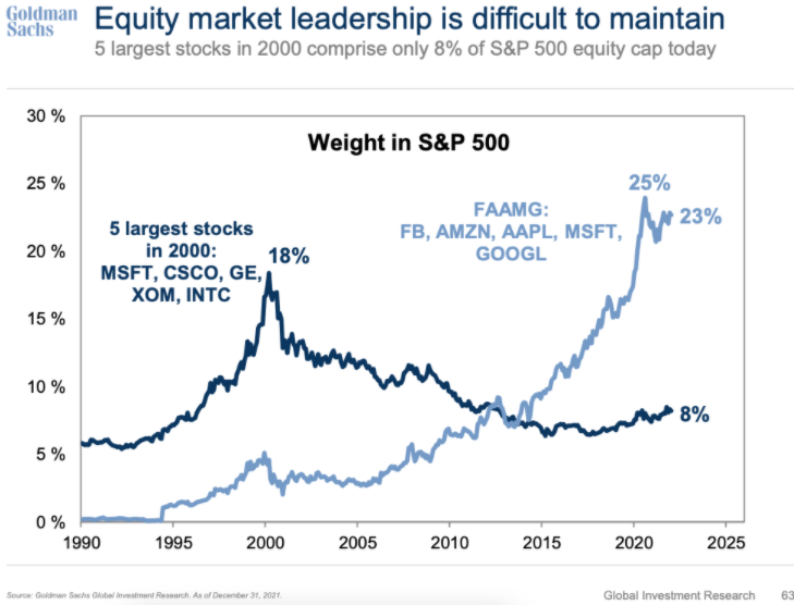 If you haven't, the message is simple: Five stocks (Facebook, Apple, Amazon, Microsoft, and Google) account for about a quarter of the market capitalization of the S&P 500, which consists of 500 companies.