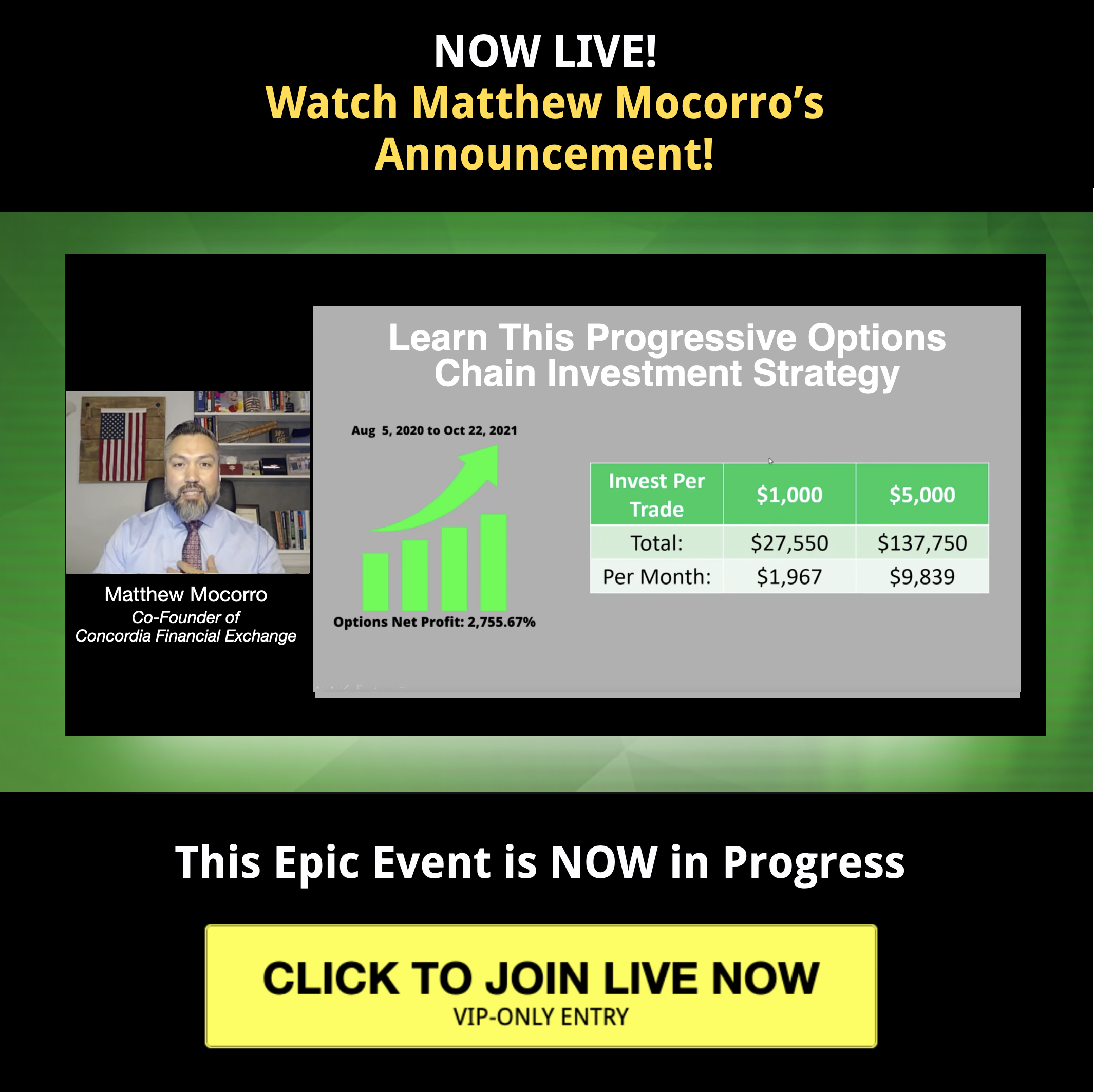 LIVE UPDATE: Matthew Mocorro's LIVE Training: Profiting From The Coming Pops and Drops in the Market With 4D Market LIVE! Closes completly TONIGHT in Only 2 hours... UNTIL then you can watch it... HERE NOW! You have only 2 Hours left to join VIP-ACCESS LIVE now and take careful notes as you learn Matthew Mocorro's methods...