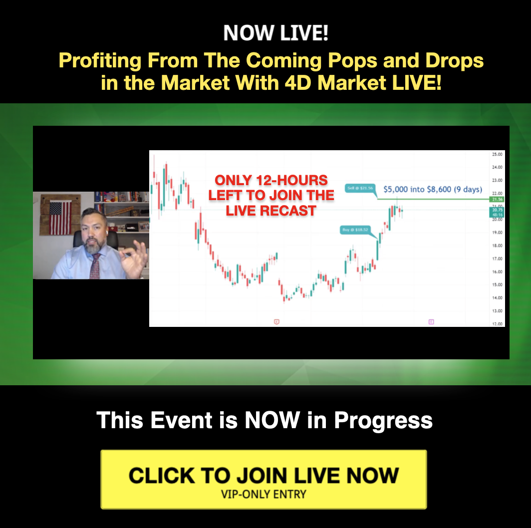 June 19th LIVE UPDATE: Matthew Mocorro's LIVE Training: Profiting From The Coming Pops and Drops in the Market With 4D Market LIVE! Closes completly TONIGHT in Only 12 hours... UNTIL then you can watch it... HERE NOW! You have only 12 Hours left to join VIP-ACCESS LIVE now and take careful notes as you learn Matthew Mocorro's methods...