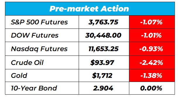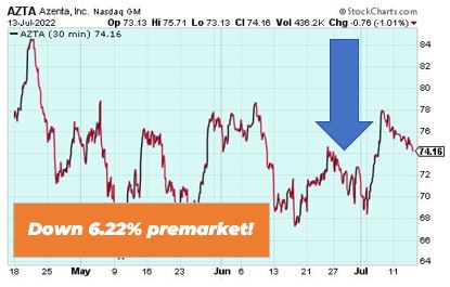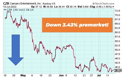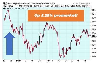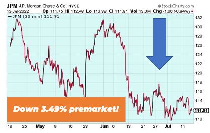 Good morning Wake-Up Watchlisters! While you're sipping your non-alcoholic watermelon cooler you'll see stock futures fell Thursday after a hot inflation report led traders to weigh the possibility of an even tighter monetary policy. All eyes will be on banks as earnings reports roll in from the major players. We won't sugarcoat it – the markets have been tough in 2022. But War Room members are hardened pirates in choppy Wall Street waters. With a 90% win rate on hedge trades in 2022, we're ringing the register and protecting ourselves against losses. Right now we're guaranteeing members receive 322 winning trades in their first 12 months. Are you ready to join us? Click here to enter The War Room. Here's a look at the top-moving stocks this morning. First Republic Bank (FRC)First Republic Bank is up 5.35% premarket after the bank reported stellar second quarter earnings. Year-over-year revenue increased 23% and earnings per share increased 11%. CEO Mike Roffler cited 'consistency of our client-focused model, strong loan growth and credit quality' as the reason for the excellent quarter. Azenta (Nasdaq: AZTA)Azenta is down 6.22% premarket after the company reported earnings for the third quarter. The company cited lower than expected demand as the reason for its 1% revenue growth in its services segment. Revenue for the Products segment was estimated at $47 million, down 3% year over year. Technology companies have been struggling in 2022. However, there's an emerging medical invention that SpaceX Founder Elon Musk recently sent into orbit. Our friend Alexander Green is calling it 'the biggest healthcare innovation in half a century' and says its $10 stock is poised to shoot to the moon! Click here to learn more about this game-changing technology. JPMorgan & Chase Co. (JPM)JPMorgan is down 3.49% premarket after the bank reported a fall in second-quarter profit on Thursday. The largest bank in America set aside more money to cover potential losses in the face of growing risks of a recession. The four biggest U.S. banks are expected to record $3.5 billion of loss provisions, bracing for a sharp economic slowdown. Caesars Entertainment (Nasdaq: CZR)Caesars Entertainment is down 3.43% premarket after Wednesday downgrades from KeyBanc analyst Brett Andress, amid growing concerns over the companies' prospects as a potential economic recession looms. With inflation numbers for June coming in at 9.1%, people will also likely cut back on discretionary spending. First Half Report: The Good, the Bad and the Ugly It's been a painful first half of 2022. However, despite the roughest start to the market since the 1970s, there have been some big winenrs. Our Head Trading Tactician Bryan Bottarelli reveals how to play these winners to your advantage in this video. Click here to watch. Those are the top market movers today. Happy trading! The Wake-Up Watchlist Research Team |