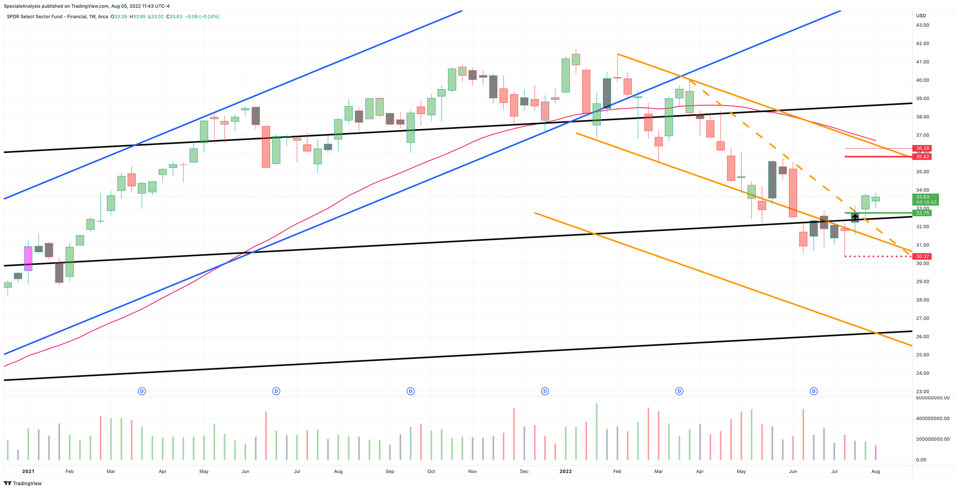Good morning, and welcome to today's edition of A Better Way To Wealth! When I'm looking for broad exposure to a sector, I typically look to a liquid exchange-traded fund (ETF) rather than try to pick a specific stock. So, for this week's 1% Blueprint idea, we're looking at the Financial Select Sector SPDR Fund (XLF). Price action broke several forms of support and hovered around the area for several weeks before a reversal transpired. It then tested the orange structure below and settled above the black structure on the week of July 18. Here's where it could potentially go next... |