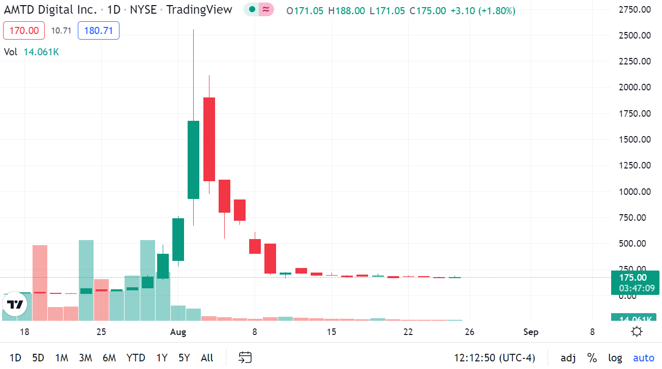 For example, one of the hottest IPOs this year was AMTD Digital Inc. (NYSE: HKD). It spiked +19,000% in less than a month … here's the chart.