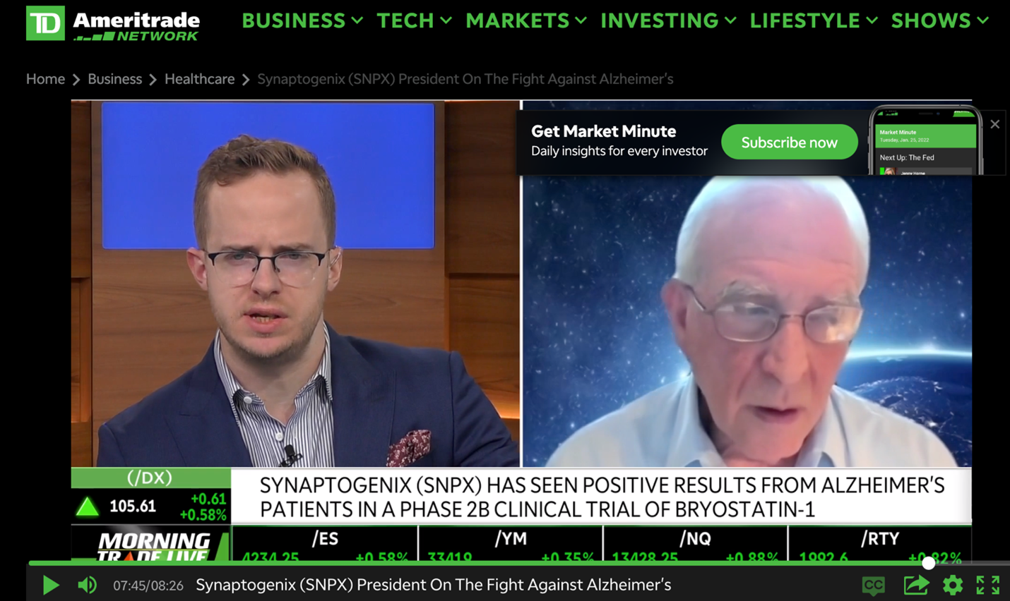 Good day, Traders! One of our latest emails about Synaptogenix (SNPX) detailed some very disturbing health risks for a previously FDA-approved Alzheimer's (AD) treatment. In contrast, SNPX's Bryostatin-1 – being designed to not only slow the progression of AD but to REVERSE its effects -- has an extremely well-established safety profile. This drug candidate has already undergone testing in more than 1,500 people in cancer studies and in Phase 2a pilot Alzheimer's disease trials. Bryostatin-1 is entering into its NIH-supported Phase 2b clinical trial for patients suffering from moderate to severe Alzheimer's disease, with ALL patients enrolled. A phase 2b clinical trial patients and determines efficacy and statistical trends prior to initiation of Phase 3 studies. To understand the mind-saving potential of Bryostatin-1 and how it differs from other treatments, we strongly encourage you to watch Dr. Daniel Alkon's interview (President & Chief Science Officer) with the TD Ameritrade Network found here. |
