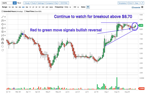 SNPX eagerly awaits the read out of its topline data later this year, expecting to announce the fourth quarter of 2022 – right around the corner 🤞🙏🤞. From a technical standpoint, SNPX stock moving higher inside of the recent trading zone. I am using a Heiken-Ashi chart to look for possible trend reversals on the chart below. Notice how SNPX has recently flipped to "green"? This is typically a bullish signal. It is very important to watch the $8.70 level for SNPX, which we are getting closer and closer to now. This was strong resistance in the past, and it the stock breaks that we could see a much higher move. Looking at previous moves, the next resistance level would be near $10.50, which is over a 25% move higher from current levels. |