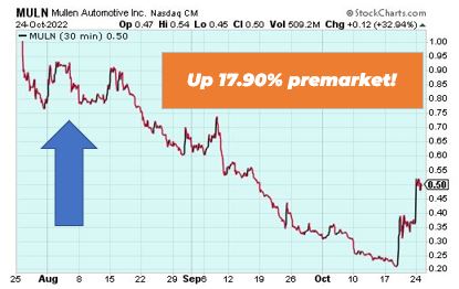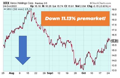Xerox (Nasdaq: XRX) Xerox is down 11.13% premarket after releasing its third quarter earnings. Revenue was down 0.4 percent year-over-year. Adjusted earnings per share came in at $0.19, down $0.29 year-over-year. The copy company also lowered revenue guidance to a range of $7.0 billion to $7.1 billion. If you've experienced any investment losses this year, you'll want to hear what Alpesh Patel, the No. 1 Stock Forecasting Champion from the Financial Times, is saying how these down markets could lead to the biggest windfall of your life. Click here to discover one of the world's best-performing hedge funds. Mullen Automotive (Nasdaq: MULN) Mullen Automotive is up 17.90% premarket after securing a sales license for the I-GO in Europe. I-GO is a commercial electric vehicle that bridges the gap between the growing demand for quick deliveries and space constraints found throughout the dense cities of Europe. Do you know how to 'follow the money' to profits? When markets are down, you need an edge. And tracking insider buying (the legal kind) can be an effective strategy for predicting massive swings in the market. Our Head Fundamental Tactician Karim Rahemtulla shows members how to see what the big money people are doing in his Insider Matrix. Click here to unlock the Insider Matrix. Those are the top market movers today. Happy trading! The Wake-Up Watchlist Research Team |