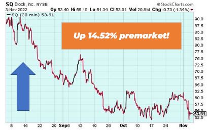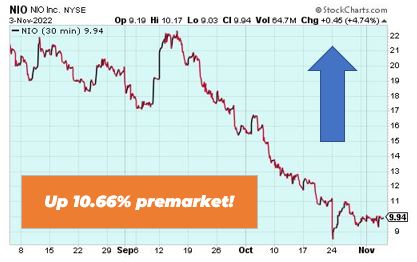 | Good morning Wake-Up Watchlisters! While you're sipping coffee you'll see the market surged on Friday. Chinese stocks in particular soared due to signs that authorities are trying to ease the impact of its Covid-Zero policy. Investors were optimistic after hearing news that a system penalizing airlines for bringing virus cases into the country may be scrapped. Look, it's no secret the economy is struggling, and many hard-working families are seeing their retirement savings plummet. Our friend Alpesh Patel isn't happy about this, and he wants to show investors how they can turn a disastrous market into the biggest windfall of their lives. If you've suffered investment losses this year, please check out this video. Here's a look at the top-moving stocks this morning. NIO, Inc. (NYSE: NIO) NIO is up 10.66% premarket after the electric vehicle company's shares dipped 5% on Thursday. Nio reported a sharp year-over-year increase in vehicle deliveries last month, however investors are getting anxious over COVID-19 restrictions in China. Delivery results and price cuts from Tesla might have also played a role. The electric vehicle sector is undergoing a major shift. It's estimated the EV market could be worth as much as $7 trillion in the coming years. Which is why our friend Andy Snyder is pounding the table on this startup company. He even believes this innovative car could be more popular than Tesla one day. Click here to unlock this $25 EV stock. Block (NYSE: SQ) Block is up 14.52% premarket after reporting third-quarter results that topped analyst expectations. Revenue increased 17% year-over-year to $4.52 billion. Excluding Bitcoin revenue, the total net revenue in the third quarter was $2.75 billion, up 36% year-over-year. Want to learn how to better predict when a stock will soar? Tracking insider buying (the legal kind) is one way to do it. See how our Head Fundamental Tactician Karim Rahemtulla shows readers how to follow the money as part of his Insider Matrix. This strategy has been proven to lead to gains as high as 2,250%! Click here to discover the Insider Matrix. |