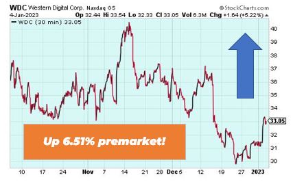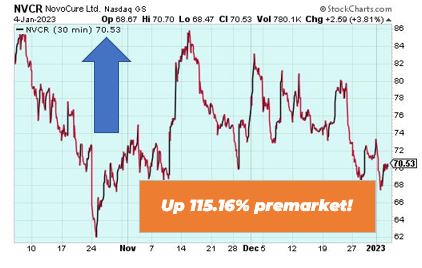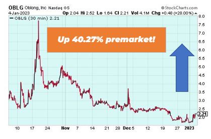 | Good morning Wake-Up Watchlisters! While you're sipping coffee you'll see stock futures bumped up on Thursday. Investors are preparing for labor market data and more Fed talk from central bankers. The monthly jobs report should be telling as several companies recently announced plans for layoffs, including retail giant Amazon, which plans to cut at least 18,000 employees. Attention Traders: We've been waiting for this technology for over 20 years and now we finally have it! This trading tool has the potential to change the way you trade forever, and we're going to show you exactly how it works on Wednesday, January 11 at 2 p.m. EST. You won't want to miss this. Click here to get on the guest list for our Accelerated Profits Summit Live. Here's a look at the top-moving stocks this morning. NovoCure (Nasdaq: NVCR) NovoCure is up 115.16% premarket after announcing a pivotal LUNAR study in non-small cell lung cancer met its primary overall survival endpoint. The LUNAR study is a pivotal, open-label, randomized study evaluating the safety and efficacy of Tumor Treating Fields together with standard therapies. NovoCure expects to release the full results of the LUNAR study at a future medical conference. Biotech stocks offer high gain potential on long plays, and our friend Alexander Green wants you to know about this one company. Right now this medical group has the patent on a device that could be 'humanity's next big leap.' Click here to unlock this $3 stock. Oblong, Inc. (Nasdaq: OBLG) Oblong is up 40.27% premarket after the award-winning maker of multi-stream collaborations announced it will incorporate a reverse stock split. The stock split is intended to increase the per share trading value of the company's common stock. |