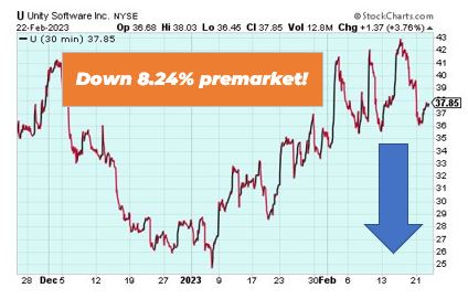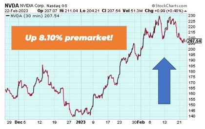 | Good morning Wake-Up Watchlisters! While you're sipping coffee you'll see stock futures rose on Thursday. The levels were boosted as investors grew confident the Federal Reserve's peak interest rate would be within levels already priced by the markets. US jobless claims data may help shine a light on the strength of the labor market, which has remained stubbornly high through the rate-hiking cycle. With recession fears looming, it's crucial to consider the potential amazing buying opportunities once prices drop. In The War Room, we use short and long trading strategies to help traders maximize their gains while minimizing risk. Click here to join The War Room. Here's a look at the top-moving stocks this morning. NVIDIA Corporation (Nasdaq: NVDA) NVDIA is up 8.10% premarket after its earnings report beat estimates on the top and bottom line despite a 46% year-over-year decline in gaming revenue. Revenue came in at $6.05 billion versus $6.02 billion expected. Data center revenue, which includes AI chips, grew 11% overall. Chips are now the ultimate source of economic power, and China is looking to dominate the chip market in the coming years. If they succeed, it could spell economic doom for the U.S. But there's reason to believe this US company could see a 525% increase as they look to stop China's chip dominance. Click here to unlock this US tech stock. Unity Software, Inc. (NYSE: U) Unity Software is down 8.24% premarket after shares fell in the extended session on Wednesday after the game-engine and app-monetization company's outlook fell short of Wall Street estimates on a weak mobile-ad market. Unity forecast revenue of $470 million to $480 million for the first quarter, and revenue of $2.05 billion to $2.2 billion for the year. Tech stocks have seen a massive fall in 2022, but there's good to reason to believe there's something new on the horizon. Immersive technologies like AI and ChatGPT are taking center stage, and our friend Andy Snyder believes there's one company at the center of this new tech revolution that could hand you life-changing profits. Click here to learn more about XRI. |
