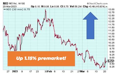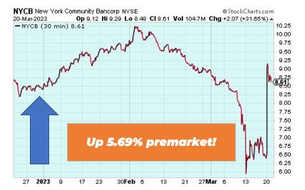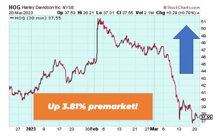 | Good morning Wake-up Watchlisters! While you're sipping coffee you'll see stock futures rose on Tuesday as banks continue to see relief (more on that below). Investors are also waiting on the outcome of the Federal Reserve's latest monetary policy meet, which is expected to include a 25-basis-point rate hike on Wednesday. With the markets still volatile, it's important to consider alterative investment ideas. Right now our friend Marc Lichtenfeld has an unusual way to potentially bank massive income from the oil and gas surge. This is NOT a stock, bond or private company, and it's a way you could collect monthly income over and over again… for life. Click here to see why the average return on this unusual class of investments was 196% last year. Here's a look at the top-moving stocks this morning. First Republic Bank (NYSE: FRC) First Republic Bank is up 22.17% premarket after a broad recovery in the banking sector across Europe and the United States. Fellow regional lenders Bancorp and PacWest Bancorp are also rising. JPMorgan Chase Chief Executive Officer Jamie Dimon is gathering a new plan to aid First Republic. The move would potentially convert $30 billion in deposits that a group of US banks injected into a capital infusion We've been avoiding the panic and buying these bank dips in The War Room. Last week we took a 38% winner on SCHW and are looking for more trading opportunities. If you want to get in on the action, click here to learn more about overnight trading. New York Community Banccorp (NYSE: NYCB) New York Community Bancorp is up 5.69% premarket after Wedbush upgraded it to outperform from neutral based on expected earnings boost from its acquisition of Signature Bank's loan and deposit portfolio, as announced by the Federal Deposit Insurance Corp. New York Community Bancorp's Flagstar unit will operate Signature Bank's 40 branches starting Monday. Nio Inc. (NYSE: NIO) Nio is up 1.15% premarket as some investors believe it might be time to get back into the Chinese electric vehicle maker stock. According to The Motley Fool, its market demand remains high. Plus, Nio is transitioning to a new technology platform and still preparing its factories to produce new models. If the company can ramp up production and launch new products this year as planned, it could see a boost in its margins. While many electric vehicle stocks have struggled as of late, the truth is the EV market is still seeing high demand. And right now there's a $25 startup our friend Andy Snyder wants you to know about. Its car has a 1,080 horsepower engine and goes from zero-to-60 in 2.5 seconds. The Wall Street Journal says it could be the next Tesla. Click here to unlock this $25 EV stock. Harley Davidson (NYSE: HOG) Harley Davidson is up 3.81% premarket as the motorcycle company continues to behave like a bank. There's a reason for this. Harley trades with banks during times of stress, and their consumer finance operations are very large. A small bank is attached to each manufacturing organization. Although Harley is a manufacturing company, it does not carry the same risks as banks and does not have any deposits that can be withdrawn. Those are the biggest stock movers for today. Happy trading! The Wake-Up Watchlist Research Team |