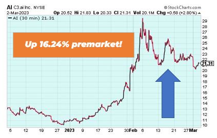 | Good morning Wake-Up Watchlisters! While you're sipping coffee you'll see stock futures rose on Friday. Major averages are on their way to a positive week. The S&P 500 is up 0.28%, on pace to snap a three-week decline, while the Nasdaq has a 0.6% gain. If you want to see how we're playing the latest market moves, we invite you to join us in The War Room. We have a 76% win rate in 2023 and right now we're guaranteeing members receive 252 winning trades in their first 12 months. Click here to join The War Room. C3.ai (NYSE: AI) C3.ai is up 16.24% premarket after posting strong revenue numbers for its third quarter. Revenue came in at $66.7 million versus estimates of $64.2 million. C3 is up 90% year-to-date, a reversal from its 2022 performance when shares were severely hit. Its adjusted loss per share came in at 6 cents, narrower than the expected loss of 22 cents. A new tech revolution is upon us, and our friend Andy Snyder wants you to know about this innovative tech stock. J.P. Morgan says this new technology will likely "infiltrate every sector in some way in the coming years." And no, it's not blockchain or crypto. Click here to discover what XRI is all about. Zscaler, Inc. (Nasdaq: ZS) Zscaler is down 12.08% premarket after the cybersecurity company hiked its revenue forecast for the year while announcing layoffs. It's cutting 3% of its workforce, a total of 150 positions. It also missed under for revenue at $1.1 billion. |