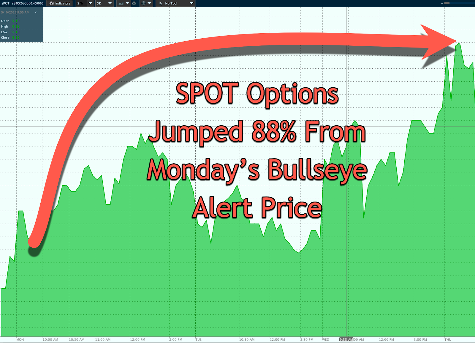 This week's Bullseye Trades "Pick of the Week" is a perfect example, as the SPOT call options I told my Bullseye Trades members about on Monday surged in an otherwise sideways market.