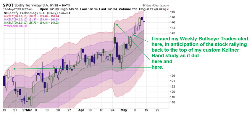 As this next chart shows, I identified that SPOT was setting up for another overshoot to the top of my custom Keltner Band study, which is a strong tendency that this stock often exhibits.