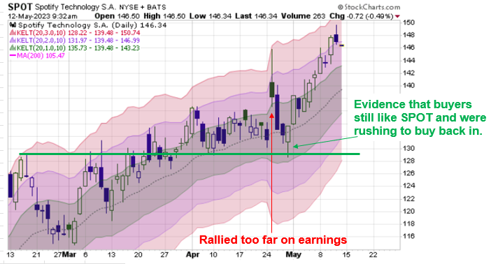 Although SPOT jumped higher on earnings day, this next chart shows how I used my CUSTOM Keltner Band study to identify that the stock had rallied too far, too fast for me to chase near the top of this study, and that I needed to wait for the stock to fall back to support to see if buyers were still around.
