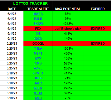 (These are the max potential our picks moved from the time of the LIVE alert- *results not typical, performance not promised ) (I probably would have gone 17/18 if RagingBull's CEO Jeff Bishop didn't mess up my pretty chart with those FDX calls as my guest trader last week. Just kidding, kind of 😂)