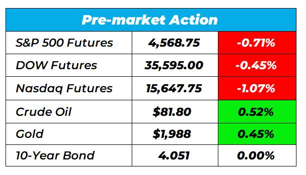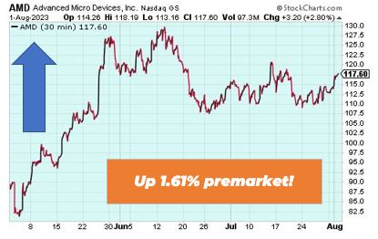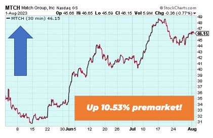 | Attention Readers: Today is the day. We're going live at 2 p.m. ET to reveal our latest AI-trading platform. This new tech has the potential to change the way you trade forever. Click here to sign up today. Good morning Wake-up Watchlisters! While you're sipping coffee you'll see stock futures dropped as Fitch Ratings' downgrade of the US government debt caused investors to avoid riskier assets. Fitch cited the fiscal deficit and an "erosion of governance" as the reason for the downgrade. When the markets fall, it's crucial to consider alternative investments outside the market. Our friend Marc Lichtenfeld has been pounding the table on an alternative investment he believes could hand you monthly income over and over again… for life. Click here to unlock Marc's No. 1 pick for 2023. Here's a look at the top-moving stocks this morning. Match Group (Nasdaq: MTCH) Match Group is up 10.53% premarket after the company benefited from its more flexible subscription plans. Its cheapest plans for smaller durations are resonating with inflation-hit consumers who are looking to cut discretionary spending. The company also plans to launch Tinder's high-end membership in the early fall, forecasting revenue between $875 million and $885 million for the third quarter. Advanced Micro Devices (Nasdaq: AMD) Advanced Micro Devices is up 1.61% premarket after second quarter results slightly beat Wall Street estimates. The chipmaker's revenue forecast was also slightly better than anticipated. Overall, revenue topped $5.36 billion vs. the estimate of $5.32 billion. Right now China's sinister plan could bring about drastic negative changes to the U.S. economy, with the chipmaker sector going through an important transition as a result. Click here to discover how a U.S. company is fighting back and why its stock could surge 525% as a result. |