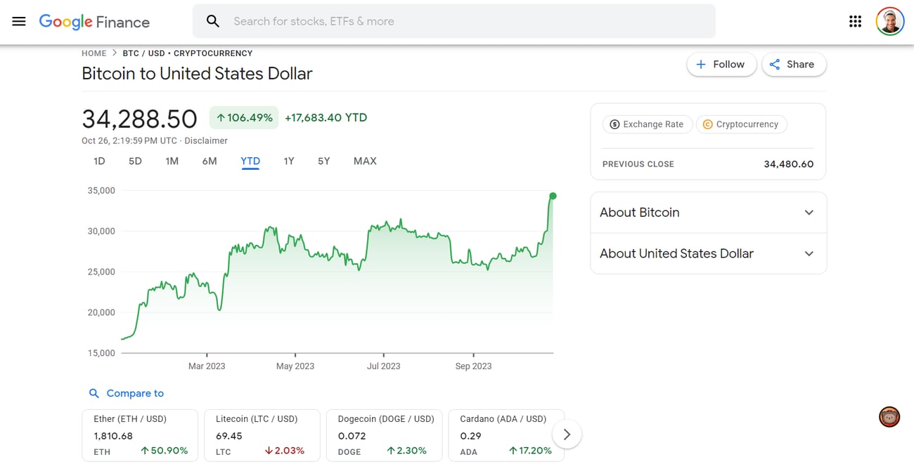 Go ahead and check your Google Finance… |  | The big picture is this simple: Year to date, BTC is up 106%. Where is Gold…? Where is the Oil or the Energy Sector…? Do I blame Moe for his views on Bitcoin? Heck No!