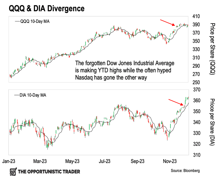 A Huge Market Rotation Is Already Underway By Larry Benedict, editor, One Ticker Trader Hey traders, Larry here with your December edition of One Ticker Trader. The end of 2023 is fast approaching. And what a year it’s been. The good news is that there’s still time to capture more gains ahead. We’ve seen massive moves since stocks bottomed in late October. And I think there’s a lot more to play out before this year is done. Last month, we switched from trading the S&P 500 to the Invesco QQQ Trust Series 1 (QQQ). And it’s fair to say things didn’t go our way. We made the switch to capture one of the most lackluster earnings I’d seen in Big Tech for some time. Cloud computing growth was slowing down – a key driver of Big Tech’s earnings growth (and their mega-cap valuations) these past five years. We anticipated that this would play negatively into QQQ, given that Big Tech makes up 43% of its holdings. When stocks are priced for growth and that growth disappears, that leaves them vulnerable to a correction. And I still think a correction is due. The market seems to be ignoring that the dozen or so interest rate rises we’ve seen have to slow the economy. That means slower growth. We don’t see this scenario changing. The huge drop in job openings (down 617,000 from October and its lowest level since March 2021) was further evidence of an economy slowing down. But as we saw, the market resisted any hint of a pullback last month. That’s why we rolled our puts to give us more time for the move to play out. Yet since we lost $2.93 on the rolled put, we'll need to make at least 63% on the one we have on our books to fully recoup the loss. We still believe that there is more to come from this trade. In fact, this month’s theme makes me even more certain of it. That’s why I want to continue holding our QQQ puts for the time being. As always, if there is any change, we’ll be sure to let you know immediately. Now let’s take a look at our new ticker for this month. In December, we’ll be trading the SPDR Dow Jones Industrial Average ETF Trust (DIA). Let’s check out why… Why We're Choosing This Trade If you’ve been with us at One Ticker Trader for a while, you may recall that we’ve traded DIA before. Last year in November, we made the same switch from QQQ to DIA. And it worked well, netting us three straight winners in a row. But while we traded DIA with great success, that’s not the reason we’re making the switch today… Instead, the reason comes back to the relationship between QQQ and DIA… On December 1, DIA made its year-to-date high. Yet while DIA was rallying, QQQ was lagging conspicuously behind. On a day when DIA rose 1.4%, QQQ was down 0.25%. This doesn’t happen very often. But it hasn’t just been a one-off divergence… In the six trading days up till then, this divergence happened four of those days, with DIA rallying while QQQ was falling. DIA is an index filled with old-name industrial stocks. So this its outperformance over the tech-heavy QQQ means something important is playing out. We’re seeing a massive rotation out of the mega-cap growth tech stocks into high dividend-paying stocks. Or more simply, it’s a switch from growth to value stocks. You can see this recent clear divergence in the chart of both DIA and QQQ below.  (Click here to expand image) The best way to see this divergence is with the 10-day Moving Average (MA, black line). As you can see, QQQ has flattened and rolled over while DIA continues to rally strongly. Although it might not seem obvious, consider the money flows required to generate such a strong divergence – especially given some of Big Tech’s trillion-dollar valuations. According to ETF Fund Flow data, from November 24–30, QQQ had $4.825 billion in net outflows while DIA had $158 million of net inflows. This move doesn’t bode well for QQQ. There have only been nine other times in the last two years where the spread between DIA and QQQ has been bigger than it is now. And what happened after the spread hit these levels wasn’t pretty… On average, QQQ ended up being 3.8% lower 50 days later. What’s more, three times, QQQ was down more than 11%. This rotation out of large-cap growth into dividend-paying value stocks is happening right in front of us. And it could be a turning point for the market. So for now, we’re going to keep our puts on QQQ… and look to open new positions in DIA. We anticipate there will be great opportunities to benefit from this divergence this month with DIA as well, so please stay tuned for our first trade alert, which will hit your inbox soon. Don’t forget that if you have any questions, please send them through to feedback@opportunistictrader.com Regards, Larry Benedict Editor, One Ticker Trader Download the Opportunistic Trader Mobile App To make sure you don’t miss any alerts or updates, please download the free Opportunistic Trader Mobile App for iOS or Android. The app enables you to get notifications whenever we publish something new. Make sure push notifications are enabled through your phone settings to receive alerts from the app. You can also access all of your subscriptions and view portfolios. And if you use the app and find it valuable, consider leaving us a review on the App Store or Google Play page. | |