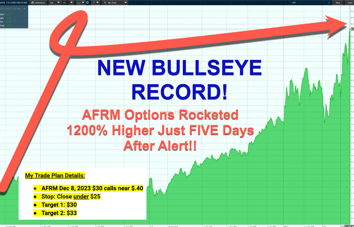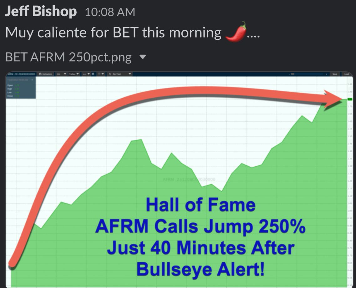 | Now I don't usually post about my pick of the Week results the DAY OF or even by Friday after the picking – as I let the plan play out for over the next week or two as these positions can take time to work out. | But folks, I'm not sure I've seen a faster mover – wowza! | Over 12,000 excited Bullseye members had the opportunity to jump on this idea. Was YOUR name on this list? | | My Bullseye members got a full rundown of why I picked this piece of scum stock this week as well as my overall thoughts on Market direction… | Like they do EVERY Monday at 11am EST! | That discussion is recorded and on the Dash for on-demand viewing for my members 📹. | You can watch it ANY TIME and use it to help develop your trade plans for the week. | So, if you're still on the fence – may I politely ask you to get off it? | Give Bullseye a try (JOIN HERE) and be IN for next week's pick! | And if you don't like it 🥺, I offer a 30-day satisfaction guarantee so what's your excuse not to give me a try??? | To YOUR success! | | P.S. If you're already a Bullseye Trades member, why not consider upgrading to Bullseye Unlimited where you'll get my TOP THREE trading ideas EVERY DAY including Monday's Pick? Make the leap today with a monthly plan (new)! | And finally — check out how Jason is ALSO killing it!!! | | | | MORE great trading resources to consider: | Get instant access to Jeff Bishop's top trading ideas | For today's hottest stocks flying under the radar, hook arms with 360 Wall Street. | Click here for unique private investing news & opportunities. | | Questions or concerns about our products? Email Support@ragingbull.com | © Copyright 2022, RagingBull | | DISCLAIMER: To more fully understand any Ragingbull.com, LLC ("RagingBull") subscription, website, application or other service ("Services"), please review our full disclaimer located at https://ragingbull.com/disclaimer. | FOR EDUCATIONAL AND INFORMATION PURPOSES ONLY; NOT INVESTMENT ADVICE. Any RagingBull Service offered is for educational and informational purposes only and should NOT be construed as a securities-related offer or solicitation, or be relied upon as personalized investment advice. RagingBull strongly recommends you consult a licensed or registered professional before making any investment decision. | RESULTS PRESENTED NOT TYPICAL OR VERIFIED. RagingBull Services may contain information regarding the historical trading performance of RagingBull owners or employees, and/or testimonials of non-employees depicting profitability that are believed to be true based on the representations of the persons voluntarily providing the testimonial. However, subscribers' trading results have NOT been tracked or verified and past performance is not necessarily indicative of future results, and the results presented in this communication are NOT TYPICAL. Actual results will vary widely given a variety of factors such as experience, skill, risk mitigation practices, market dynamics and the amount of capital deployed. Investing in securities is speculative and carries a high degree of risk; you may lose some, all, or possibly more than your original investment. | RAGINGBULL IS NOT AN INVESTMENT ADVISOR OR REGISTERED BROKER. Neither RagingBull nor any of its owners or employees is registered as a securities broker-dealer, broker, investment advisor (IA), or IA representative with the U.S. Securities and Exchange Commission, any state securities regulatory authority, or any self-regulatory organization. | WE MAY HOLD SECURITIES DISCUSSED. RagingBull has not been paid directly or indirectly by the issuer of any security mentioned in the Services. However, Ragingbull.com, LLC, its owners, and its employees may purchase, sell, or hold long or short positions in securities of the companies mentioned in this communication. | In the event that any suit or action is instituted as a result of doing business with RagingBull.com, LLC and/or its affiliates or if any suit or action is necessary to enforce or interpret these Terms of Service, RagingBull.com, LLC shall be entitled to recover attorneys' fees, costs and disbursements in addition to any other relief to which it may be entitled. |