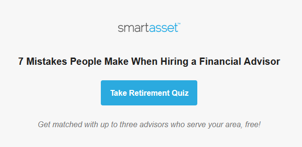 | Try SmartAsset's Financial Advisor Matching Tool Get retirement ready. Try this no-cost tool to get matched with up to 3 vetted financial advisors serving your area. | SmartAsset 122 E 42nd St #4300, New York, NY 10168 | Sources: 1. "Planning and Progress", Northwestern Mutual (2022) 2. "Journal of Retirement Study Winter" (2020). The projections or other information regarding the likelihood of various investment outcomes are hypothetical in nature, do not reflect actual investment results, and are not guarantees of your future results. Please follow the link to see the methodologies employed in the Journal of Retirement study. This is not an offer to buy or sell any security or interest. All investing involves risk, including loss of principal. Working with an adviser may come with potential downsides such as payment of fees (which will reduce returns). There are no guarantees that working with an adviser will yield positive returns. The existence of a fiduciary duty does not prevent the rise of potential conflicts of interest.