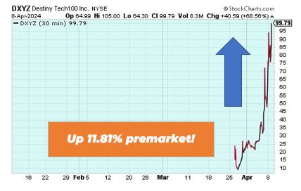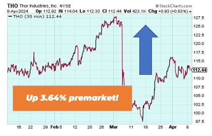 | Good Morning Wake-Up Watchlisters! While you're sippin coffee you'll see stock futures were steady on Tuesday. Investors are awaiting key US inflation figures that could spark a debate over when the Federal Reserve will cut interest rates. Catalyst events like the upcoming inflation report have the potential to swing the markets in either direction, which presents a lucrative opportunity for traders. Which is why we're setting up a new trade in Catalyst Cashouts live today at 2 p.m. Click here to join us and see how our latest government loophole strategy could lead to gains. Here's a look at the top-moving stocks this morning. THOR Industries (NYSE: THO) THOR Industries is up 3.64% in premarket after announcing a dividend of $0.48 per share, which is payable on April, 23, 2024. The mobile home provider has maintained a consistent dividend payment record since 1987, and has increased its dividend each year since 1988. Destiny Tech100 (NYSE: DXYZ) Destiny Tech100 is up 11.81% premarket and has surged nine times its original value within two weeks. The boost came following strategic investments in visionary companies, including OpenAI and SpaceX. Overall, the investments have propelled the fund's market value to $825 million. |