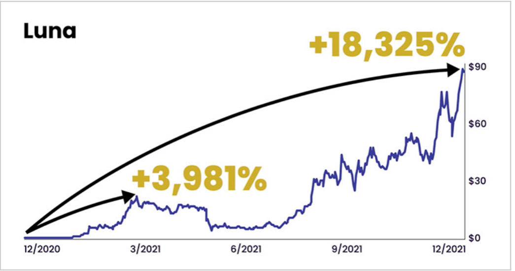 Turn $10K into $1.1 Million… in One Year? Dear Reader, 18,325% gains in a year... That's not a typo or a misprint… That's the biggest winner in my track record… so far. (See why I think I could top that over the next year.) Here's what most people think gains like that looks like: But this couldn't be further than the truth. And if you can recognize this, you'll see how I helped ordinary folks get the chance to turn $10,000 into over $1.1 million – in just one year… and how it could happen all over again starting this month. Because here's what that 18,325% winner actually looked like: On December 17th, 2020, I recommended a cryptocurrency called Luna because I knew it was set to soar. Sure enough, just three months later, it skyrocketed 3,981%. So I told folks to sell half the position and let the rest ride. The remainder of that position soared 18,325% over the next year. And on December 22, 2021, I officially closed out the rest of the position. You can see in the chart above that there were ups… with some big jumps in between. In fact, over the course of that year, the average gain per day was 50%. Anyone who followed my original recommendation and invested $10,000 would've walked away with a $1.1 million fortune on this one trade. Not everyone did though… People see a 50% jump in a day or even a week… and they think it's no big deal. But this is actually the anatomy of a 18,325% winner… a 20% gain one day… a 50% move the next week… maybe a pullback… followed by another jump the following week. Why am I telling you all this? So you don't miss out on the next big crypto windfall. You see, I recently recommended three new cryptocurrencies. They're currently up 3%... 30%... and 68%. And two weeks ago, I recommended another crypto. It's currently up 24%. In other words, these four coins are following the same trajectory of my biggest winner. You'll want to act fast. We'll soon see a catalyst that'll send these four coins to astronomical heights. In fact, it's the same catalyst that propelled my 18,325% winner. Go here to get the full details. Regards, Ian King Editor, Banyan Hill Publishing |