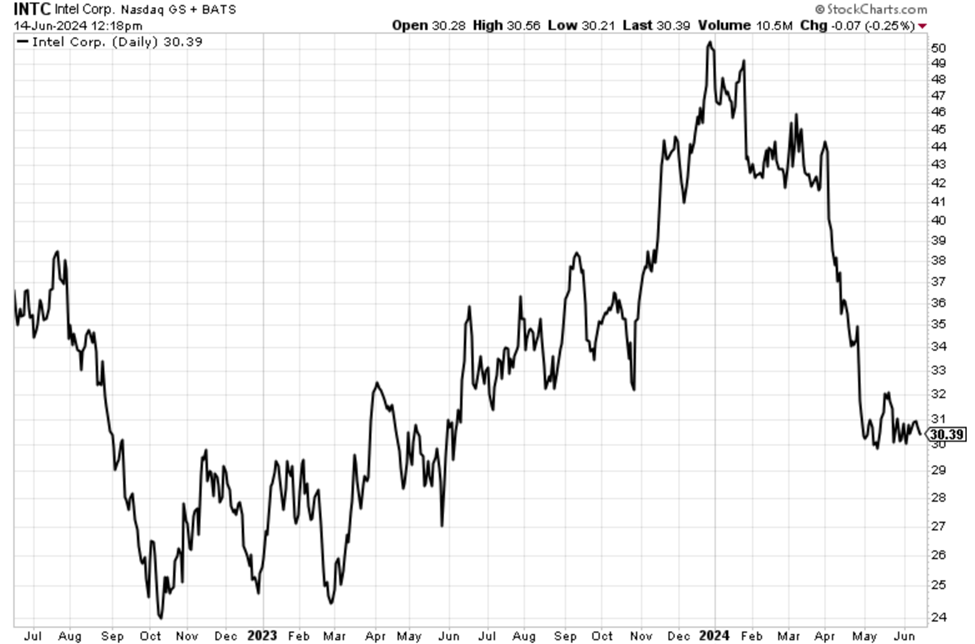 This might raise a few eyebrows. After all, as you can see below, after enjoying a 2X surge in 2023, Intel investors have watched the chip giant suffer a 40% haircut this year. So, what does this pullback represent? Is it a fantastic entry point on a visionary tech leader of tomorrow? Or is it a red flag that’s warning of a “has been” company that’s in decline?