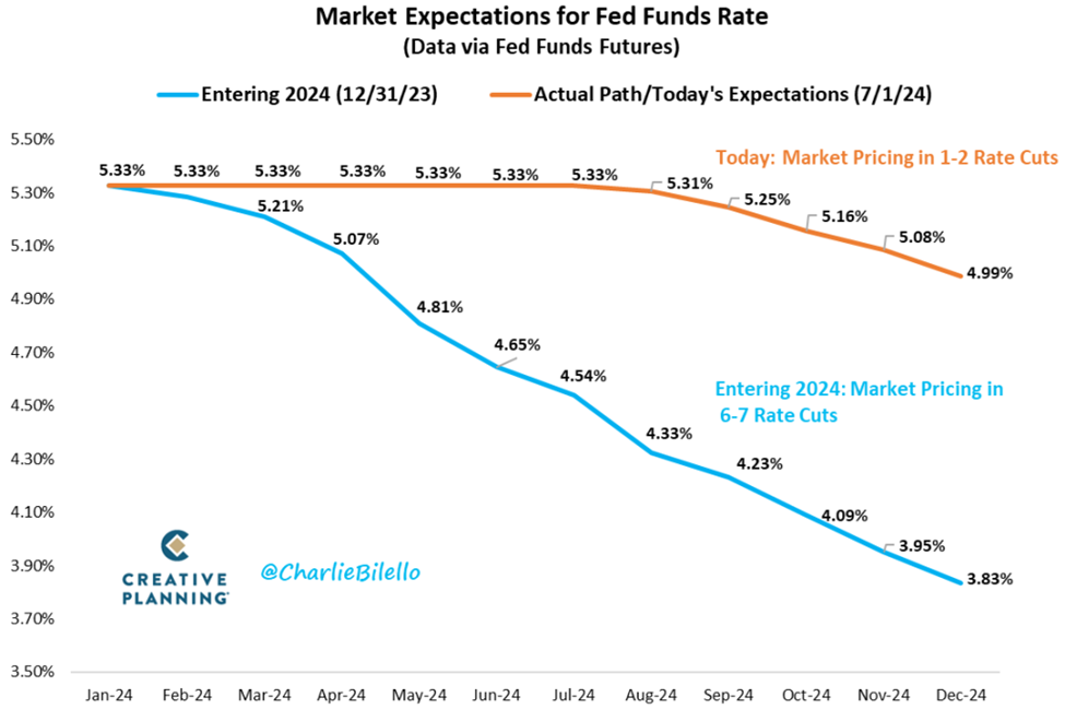 Below we look at what traders believed would be the Fed’s interest rate policy at the start of the year (in blue) compared with its actual path plus the latest expectation (in orange).  Source: Creative Planning / @CharlieBilello