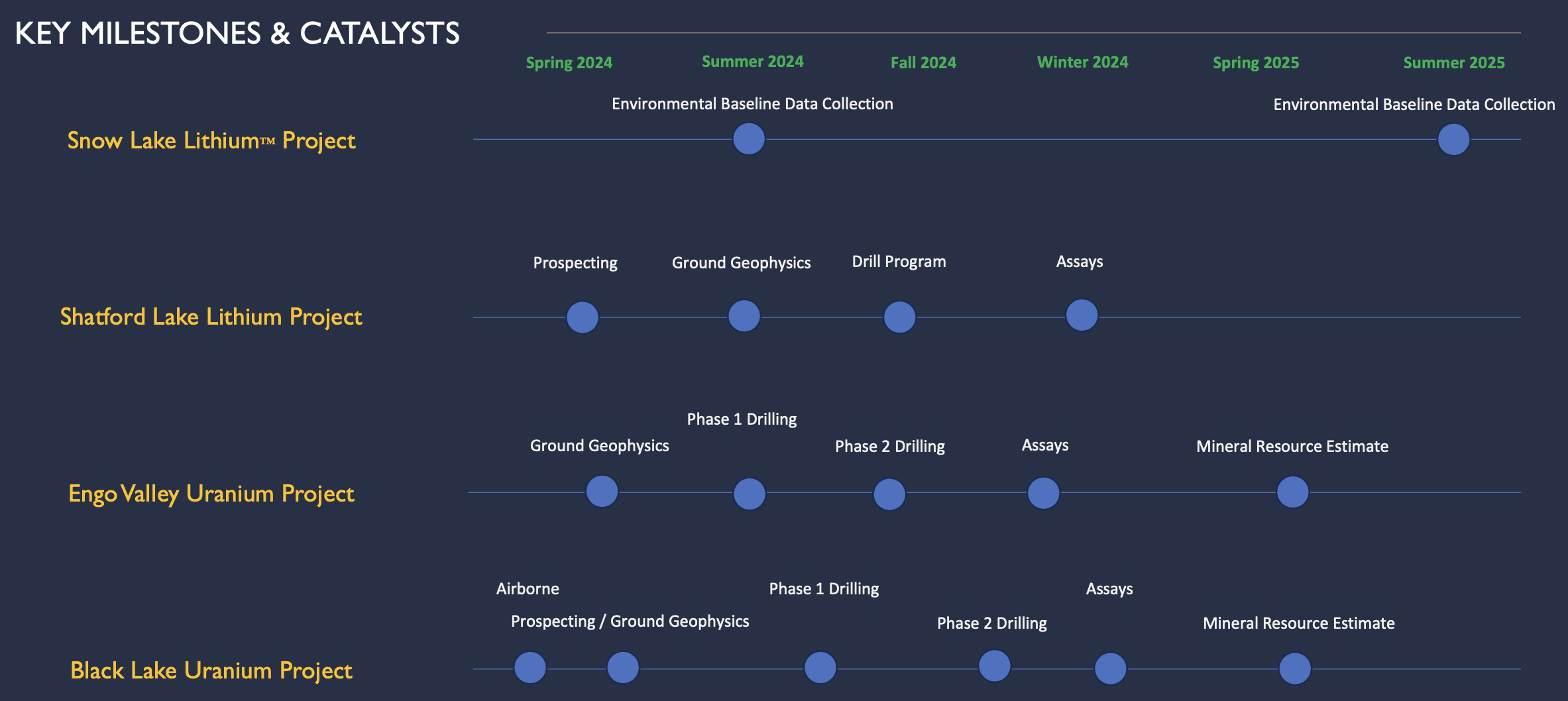 Snow Lake, together with Critical Discoveries, has designed a four-phase exploration program for 2024. Phase 1 consists of compiling and analyzing all past exploration data generated by ACME Lithium Inc., including all geophysical and geochemical data, as well as past drilling results, in order to identify targets for field work in Phase 2.