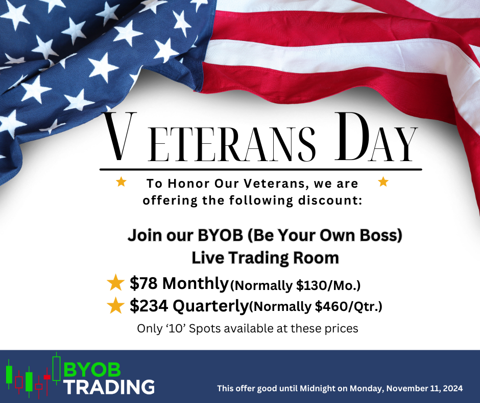 BYOB Trading Veteran's Day Sale By Admin November 08, 2024 Post a Comment , In honor of our Veterans, we are having a Veteran's Day sale! Don't miss out...40% Savings on a Monthly Subscription -OR- 49% Savings on a Quarterly Subscription. Cancel at any time. I hope to see you in the BYOB Trading Room John Check Out The Monthly Deal! Check Out The Quarterly Deal! If you have any questions, feel free to message us at Contact Us | Terms Of Use | Privacy Policy © Hit and Run Candlesticks Inc. All Rights Reserved.