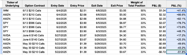 I'm seeing breakouts everywhere in this current market. I just closed multiple options trades on SPY, IWM and AMZN. Amazon popped for 86% in just 2 days on its breakout and we trimmed before its pullback Friday morning. Take a look at our last week of trading: | I entered Amazon too early on May 22nd and we got out for a loss… before ripping 4 straight winners even as the market was choppy. This next week, I expect another trade to come out. Tech is moving… and they make some of the best options trades. To see what options I'm trading next, go here, Scott Redler Editor of Power Plays Options | *Scott Redler's positions as of 2025-06-06 at 10.27.41 AM | |