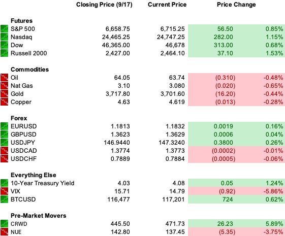 | T&Q Morning Briefing | Decision day is done—now comes the follow-through. | | | | Good morning, Traders & Quants! Markets closed modestly lower on Fed day, even as the FOMC delivered exactly what investors expected: a 25 bp cut to 4.00–4.25%. The small-cap complex swung hardest, financials and staples outperformed, while tech and industrials trailed. Treasuries dipped below 4.0% after the statement, only to finish back near 4.07% following Powell's presser. The dollar caught a bid. WTI eased, snapping its recent supply-driven run. | For all the anticipation, the outcome landed in the middle. The cut was priced, the dot plot leaned dovish, but Powell was careful not to accelerate expectations. Traders now face the challenge of reading between the lines of a Fed that is easing but still sensitive to inflation. | On the tape, small caps initially surged, high beta to short-term cuts, but rolled over as yields climbed back in Powell's Q&A. Bank stocks hit fresh 52-week highs before fading. Retail sales offered a modest silver lining, notching a third monthly gain, though housing starts and permits slipped, leaving the mortgage-rate decline as a potential stabilizer. | | | The Island Where Early Buyers Win Big | | Every market has its early adopters. In the Caribbean, that market is Roatán. | A handful of communities are scaling fast — with prices still a fraction of what you'd pay in the Caymans or Bahamas. | Buyers are already securing pre-construction deals and oceanfront lots most people won't even hear about until it's too late. | Our VIP Discovery Tour gives you direct access — before the crowd. | [Claim your invitation Now] | | | Futures are modestly higher this morning, with Europe and Asia broadly firmer after the Fed's cut. The focus shifts to the Bank of England, where rates are expected to remain unchanged at 4%, though investors are watching for a slower pace of gilt sales after recent volatility. Norway has already followed with a 25 bp cut. In Asia, Chinese equities surged to a 10-year high on news of tighter restrictions on Nvidia, lifting local chipmakers. | The near-term question for U.S. markets is whether Powell's "insurance cut" sets up a pair of reductions at the October and December meetings, as history often suggests. The labor market has cooled but remains resilient, while tariffs continue to pressure inflation. That mix keeps the Fed in a cautious easing mode. Futures imply another two cuts this year, leaving little margin for upside surprises in jobless claims or inflation data. |  | Daily Chartbook @dailychartbook |  |