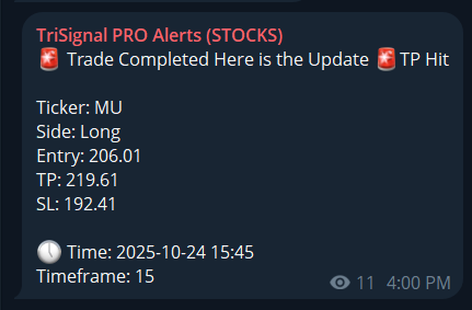 Hey guys...Ben here! I don't know what it is about this week, but the scanner's been locked in. Every alert that's fired lately has lined up almost perfectly with price. PYPL, AFRM, XAUUSD....... all of them clean triangles that moved right after the alert came through. | That's what makes this thing so easy to trust. You're not wondering if the setup's real or waiting for confirmation. You just see it, trade it, and let the move play out. Just like $MU that just hit TP late in yesterday's session... | Get my #1 my scanner here for a special EARLY ACCESS price I got live meetings with members already set up and ready to go. So anyone who joins early will be able to tune in and ask me anything! Thanks, | |