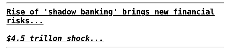 You are a free subscriber to Me and the Money Printer. To upgrade to paid and receive the daily Capital Wave Report - which features our Red-Green market signals, subscribe here. Hey... They're Catching On... (The Week in Review)A beautiful day in Maryland gives us an opportunity to reflect on the last week of volatility and other silliness...Dear Fellow Traveler: Well… the Blue Dolphins finished their regular season today… and the Under-8 girl’s team (featuring Amelia) lost 4-2… in another difficult game. We finished the season with one win… from the game that Amelia and I missed… As one of the coaches, we do our best to let all of the kids play different positions. Our opponents, however, kept their best forward in - right up front - the entire game. She scored three goals... We enter the playoffs next week against the No. 2 seed. I’m very tired… and spent a lot of time napping today (very overdue). So, now that I’m playing catch-up… Looking at charts and reading for an hour… I can’t help but notice an article that’s on the front page of the Drudge Report… It reads… Wait a minute… Washington Post… the rise of “shadow banking?” Where Have These People Been?The Washington Post headline treats shadow banking as a shocking new development after a few fraud cases hit regional banks this week. “Rise of shadow banking,” they breathlessly report. Rise? What the hell have these people been doing since 2008? Shadow banking has been larger than traditional banking for over fifteen years. Zoltan Pozsar, former Fed researcher and shadow banking expert, documented how this parallel financial system grew to dwarf regular banks after the 2008 crisis. Michael Howell at CrossBorder Capital has shown how shadow banking now represents the majority of global credit creation. Yesterday, Howell asked a question that I’ve been discussing for about a month… “Will Quantitative Easing come back?” Shadow banking isn’t new… It’s been responsible for practically every major financial crisis of the last 30 years… The Asian Financial Crisis? Shadow banking channeled short-term foreign capital into long-term local projects, leading to maturity mismatches and sudden capital flight. Long-Term Capital Management in 1998? Shadow banking. This was a leveraged hedge fund that threatened systemic liquidity. The Fed had to arrange a private bailout. The 2008 mortgage meltdown? Shadow banking through structured investment vehicles and off-balance-sheet entities. Things like Structured Investment Vehicles (SIVs), asset-backed commercial paper programs, and mortgage securitization trusts expanded significantly. By 2007, the U.S. shadow banking system was larger than the regulated banking sector. In 2011, shadow conduits included money market funds and repo counterparties financing peripheral sovereign debt. Haircuts and collateral runs deepened stress in the European Banking System for banks reliant on wholesale shadow funding. In March 2020, the Fed had to create the Money Market Mutual Fund Liquidity Facility and buy corporate bonds/ETFs to backstop shadow credit. In 2021, Archegos, a family office using total return swaps with prime brokers (outside bank balance sheets) imploded. This caused $10+ billion in losses to major banks. China’s Evergrande crisis this decade? The property developer’s collapse exposed the massive role of shadow lending and trust financing in China’s real estate bubble. The 2022 GILT Crisis in England? Pension funds using leveraged derivatives strategies (repo and swaps) faced margin calls after gilt yields spiked. The Bank of England had to intervene with emergency gilt purchases to prevent a collapse. Every boom-bust cycle traces back to unregulated credit creation outside traditional banking oversight. You can even debate the 1907 Knickerbocker Trust Crisis as a shadow banking disaster that eventually led to the Federal Reserve’s creation… So, What’s Happening Now?Regional banks are under pressure… and once again… there are concerns about banking reserves falling to levels that could trigger problems in the overnight lending markets… Zions Bank is losing $50 million on fraudulent loans, JPMorgan is taking $170 million hits on auto lender Tricolor Holdings, and regional banks are getting burned by “private credit…” The real story isn’t isolated fraud cases. It’s that “private credit” and “non-depository lending” are euphemisms for the same shadow banking system that’s been quietly financing everything the regular banks won’t touch. When traditional banks can’t make money under regulatory constraints, the shadow banks take on the risk… the banks just originate everything… On Tuesday, Jamie Dimon referred to other problems in the economy during JPMorgan’s earnings call, suggesting that “when you see one cockroach, there are probably more.” But these aren’t isolated cockroaches. They’re part of a massive parallel financial system that’s been growing in the shadows while regulators pretended it didn’t exist. The only surprise is that anyone’s surprised… At least these journalists are trying to educate people… but they’re decades late to the party… and always behind when the crisis actually hits… Now… let’s take a look at the week in review… Monday, October 13 How to Make Money Selling Dreams, Not Digging DirtDon’t chase gold… grab the royalty streams instead… Tuesday, October 14 And We’re Yellow Again... With Markets Shrugging Off Common Sense...Valuations aren’t the real story. The issue is still in the regional banks and the financials that are tied to private credit. People are getting nervous again… Wednesday, October 15 The White Swan Everyone IgnoredDid people really think that gold’s rise to $4,000 was a surprise? Unpredictable? No… the reasons for gold’s massive 2024-2025 returns were obvious… Thursday, October 16 Answers to Bernie Sanders’ 