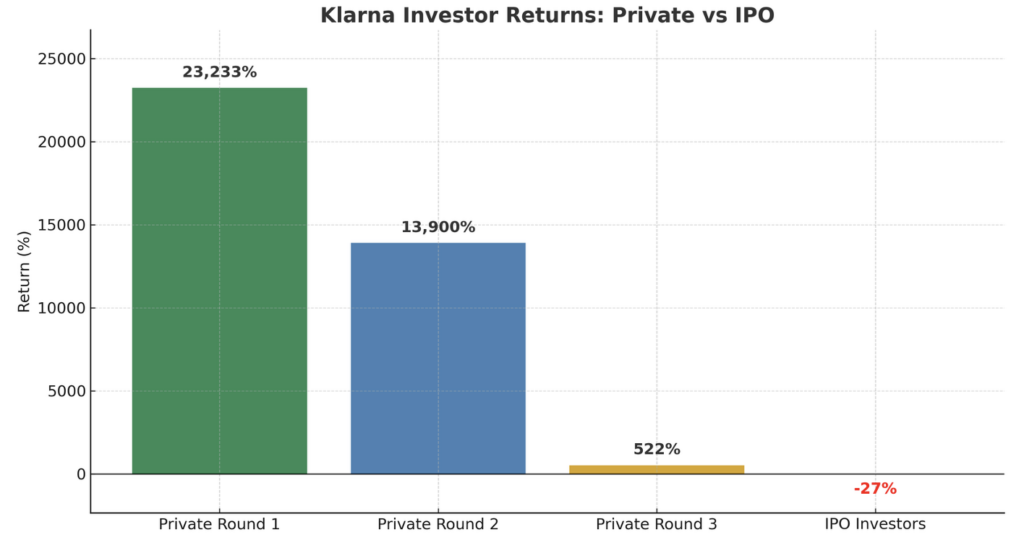 As usual, Wall Street was doing what it does best: Dangling shiny new shares in front of ordinary investors at sky-high prices. What Happened NextAt the IPO, Klarna's stock opened at $52. Fast-forward just a few weeks, and those shares are now trading at about $38. In other words, if you'd bought Klarna stock at the open, you'd be sitting on a 27% loss. And that's exactly what I was trying to protect you from. The IPO TrapThis isn't unusual. IPOs are often designed to reward insiders — the bankers, executives, and big institutions that got in earlier — while leaving everyday investors holding the bag. By the time the stock hits the open market, it's already priced for perfection. Which means there's far more downside than upside. That's why I said don't invest in Klarna's IPO — and why I'll keep giving you the same warning when the next "hot IPO" comes along. The Private Investor AdvantageBut here's the part that doesn't make headlines… Even though Klarna's IPO has been a disappointment, many of its early private-market investors are still sitting on massive profits. Let me show you what I mean: - Private Round #1