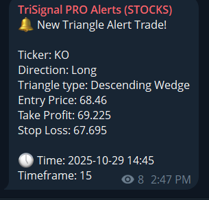 The wedge breakout pattern on KO shows potential strength returning in a defensive name right as the market's been leaning heavy on the downside. When momentum flips like this, it's worth paying attention.