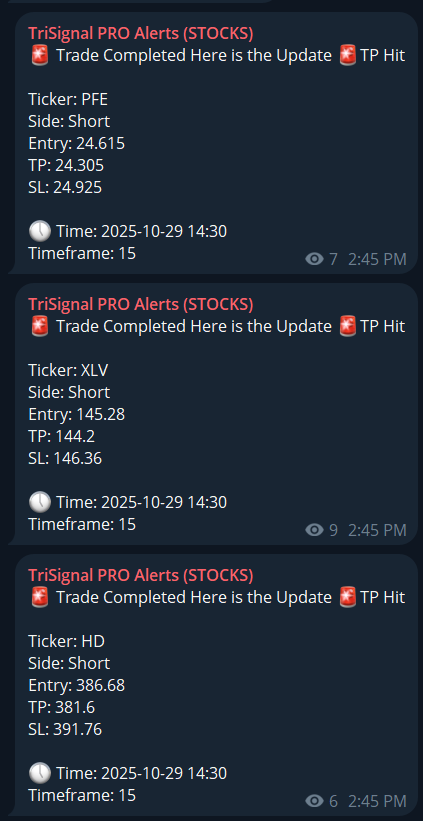 Three alerts — PFE, XLV, and HD — all tagged their TPs within the same 15-minute window, signaling strong downside momentum across sectors. -