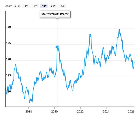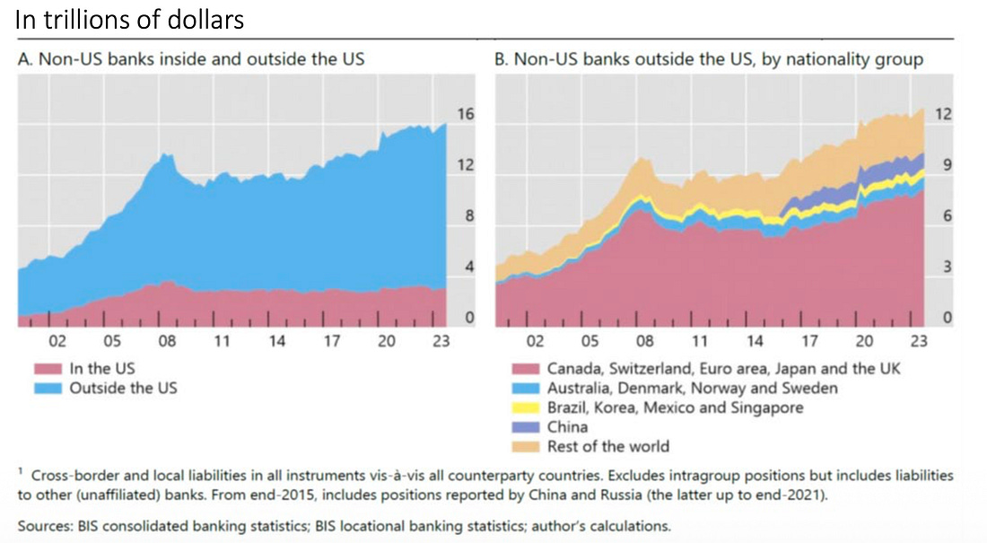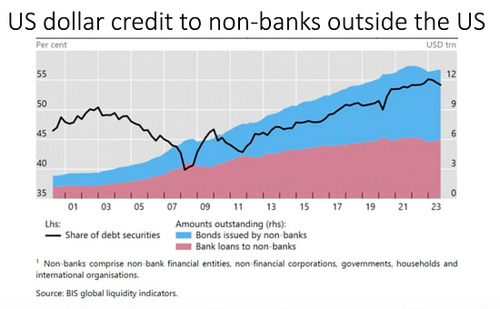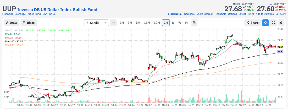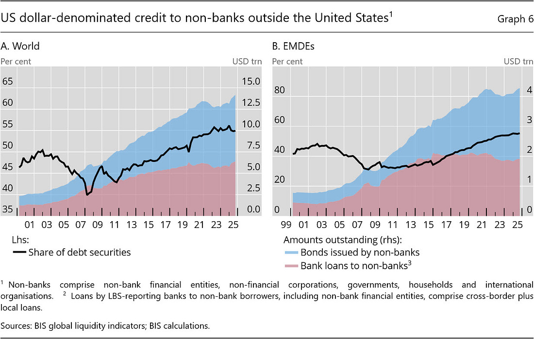 But… if you follow the Waterfall argument… You know the probability that he isn’t. Chart No. 2: The Irony of It All Perhaps nothing is more absurd than the fact that, during a slump in global markets, surging oil prices, and known issues with the debasement of paper money, the U.S. dollar is the thing that would win in a declining-liquidity environment. The Invesco DB US Dollar Index Bullish Fund (UUP) continues its upward trend… Wait… what? When global markets sell off, and liquidity dries up, every leveraged position in the world needs one thing to unwind... dollars. It’s not because the dollar is strong in any fundamental sense, but because the entire global financial system is denominated in it. Every offshore loan, every currency swap, every emerging market bond that was issued in dollars creates a claim that has to be settled in dollars. When the music stops, demand for dollars doesn’t come from confidence. It comes from the obligations. You end up with a bizarre outcome where the very currency being debased by deficits and money printing becomes the most sought-after asset in a crisis. Oil surges, equities crater, gold does whatever gold does... and the dollar rallies. Not because anyone believes in it, but because everyone owes in it. In March 2020, this phenomenon happened fast - before the Federal Reserve had to open swap lines to other foreign central banks, whose financial systems were desperate for U.S. dollars. This odd paradox is the difference between something being valuable and something being necessary. The dollar doesn’t need to be sound. It just needs to be the unit of account for $13+ trillion in offshore dollar-denominated debt. Until that changes, every liquidity crisis is a dollar crisis in reverse... the worse things get, the more people need the very thing that helped cause the problem. Isn’t global finance wonderful? Chart 3: You’re Locked Into the Dollar For Now…The global financial system doesn’t run on the dollar because everyone likes it. It runs on the dollar because $13+ trillion in offshore debt is denominated in it, because commodity markets price in it, and because the plumbing of international trade was built around it. And it’s so huge that it’s impossible to think about how it would ever be unwound in a logical manner. Wrote the Bank for International Settlements in its July 2025 Report: