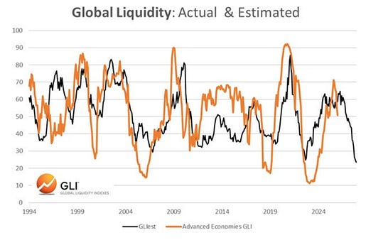 You are a free subscriber to Me and the Money Printer. To upgrade to paid and receive the daily Capital Wave Report - which features our Red-Green market signals, subscribe here. Don't Bring a Knife to a Chart Party...I'm gonna do my best to "Stay Positive" after seeing Chart No. 1Dear Fellow Traveler: It’s a beautiful day in Maryland. It’ll be 75 degrees. And what better way to spend it than outside with the dogs at the Edge of the World farm? Maryland’s second false spring has arrived… meaning that we’ll be back in the 30s by mid-week and we’ll probably have snow on Orioles’ Opening Day. Why not… Yesterday, I laid out the case that a short squeeze is possible, followed by a continuation of the trend. I’m not convinced there is a bottom in this market yet, especially with the MOVE Index surging to levels we haven’t seen since… May 2025. There’s one other reason why I’m very concerned today… The first email that arrived in my inbox… at 5:51 am. As you know, the Waterfall Structure of markets goes that liquidity lives upstream of everything. Momentum follows… then returns and everything else. When liquidity - all capital and credit available inside the system evaporates, the market follows. Well… here comes the chart that makes me swallow very… very hard. Michael Howell’s Global Liquidity Index… Bond volatility has picked up in recent weeks, as we’ve discussed. As Howell explained this morning, roughly 77% of global lending is now collateral-based, and given that Treasuries and other forms of bonds are used as that collateral, a surge in yields leads to a decline in collateral quality and HAIRCUTS to repo-style lending (you can borrow less with the same collateral as haircuts rise). These are all things I explained at length last summer while diving into Bank for International Settlements reports on haircuts and the impact of the Bank of Japan’s monetary policy on U.S. bond markets… The thing that speaks out in Howell’s analysis today - and I always recommend subscribing to his letter because of how important it is to market knowledge - is that he laid out specifically how much each $10 increase in oil prices impacts his liquidity index… how much a move in the MOVE index impacts liquidity… and how much a rise in the U.S. dollar (which is also rising) impacts the index as well… It all added up to a staggering potential decline in liquidity - and a line that I’ve written about my own commentary in the past… that made hair stand on my arms.