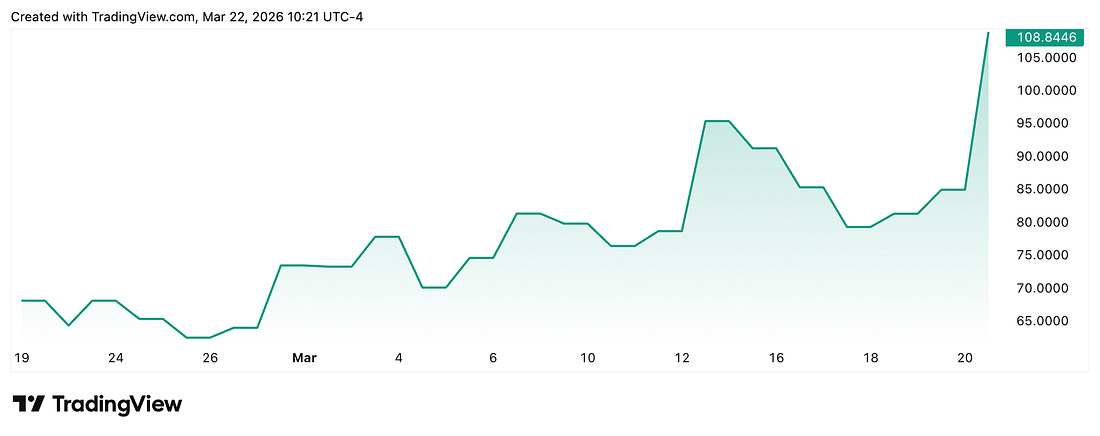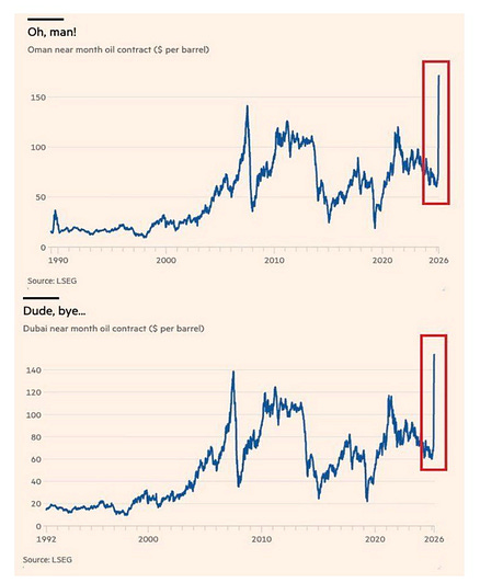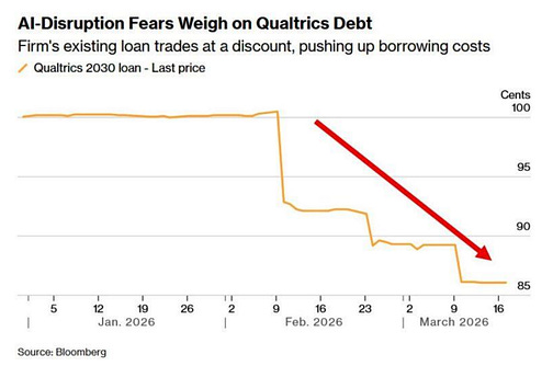 And Robert N. McCauley of Boston University and the University of Oxford showed us two charts in 2024 that showcase how the dollar spreads around the world… First dollar credit to non-banks outside the United States… in 2024… And… the trillions of dollar-based liabilities held by non-US banks abroad… Some people are saying… We might see nations just “refuse to use the dollar…” Just no more dollars… right? Rapidly and suddenly. Here’s the thing... “refusing to accept the dollar” assumes there’s something else to accept. Right now, it isn’t at scale. The euro has a fractured fiscal union behind it. The yuan has capital controls that make it unusable for global settlement. Gold can’t clear a derivatives contract. Bitcoin, for all its promise, settles about $10 billion a day. The dollar clears that before lunch. You’d have to rebuild the entire settlement infrastructure of global finance, and nobody has even started. Could it happen eventually? Sure. But “eventually” in monetary systems means decades, not news cycles. In the meantime, every liquidity crunch, margin call, and forced unwind of leveraged positions anywhere on earth creates more demand for the very thing people claim they want to abandon. The dollar… Again, that’s the paradox. The worse the dollar’s fundamentals get, the more the world needs it in a crisis. You can dislike that. But welcome to the Hotel California… You can’t opt out of it until something else can do what the dollar does. And nothing can… at least… not yet. Okay… let’s move on… Chart 4: Retail Says… Meh…Overall, retail sentiment is the lowest since November, the last time we saw a policy adjustment (the Bank of Japan's stimulus measures) and a rise in insider buying. We remain nowhere near the levels last seen during the GILT Crisis or the April 2025 collapse. But have another look at this chart… and realize that this entire market, since COVID, has just been one crisis following another… and no one ever pays the piper. We’re not at a point where capitulation would kick in… but we don’t have clear signals of a pure bottom. While I think there’s a possible squeeze in play because that’s how markets behave ahead of these more negative periods… There isn’t anything at the heavy macro-level that gives me a ton of optimism in the months ahead. I need to see some sort of monetary policy action… sorry to say… Chart 5: Energy is Still UnderownedI’ve seen this chart pop up on feeds a lot in the last week. It’s the argument that active equity funds hold a very low percentage of energy stocks in their portfolios compared to the rest of their portfolios. It’s viewed as some guiding torch that energy stocks are cheap… Well… here’s a quick counterargument to that… I love energy stocks… I love pipelines… I like certain debt-free upstream operators. I believe it’s insane that the entire energy infrastructure that would power AI is trading at multiples way lower than those of the speculative players in the AI space… But… we live in a highly financialized economy, where the SEC is now calling for more crypto-based ETFs and innovative tokenized products. The reality is that the incentives to buy and hold these assets have been continually eroded by various policies… and in a world of alpha-chasing, frictionless investing… What would you rather own when they print money? Oil or Bitcoin? A rational man might say energy… A hedge fund manager who loves leverage and momentum… and yachts? Chart 5: The AI Private Credit Story in One Chart…This chart tells a story we’ve been covering. The Qualtrics 2030 loan (in the chart below) traded at par through January, and by mid-March, it was trading at 85 cents on the dollar. That’s a 15% decline in six weeks on debt that was supposed to be good money... What changed wasn’t the balance sheet. What changed was the market’s view of the company’s future, as AI disruption risk repriced the loan in real time. This is exactly the pattern I wrote yesterday in Gates Don’t Contain a Fire. The underlying asset deteriorates, the secondary market marks it down, and by the time anyone thinks about activating redemption limits, the damage is already priced in. Gates won’t prevent this kind of repricing. They’ll just make sure the investors holding the paper can’t get out while it happens. The fire doesn’t wait for permission. And neither does the market. Watch for more of this in the months ahead… Chart 6: Contrarian Long on This Real Estate Market?One of the things I look back on is that I had a chance to invest in Dubai's real estate market in 2020, right as COVID shut the world down. I bought land in a swamp in Florida. The Dubai property went up 140% in two years. The Florida property … it broke even after a bunch of upgrades. Well… here’s the Dubai Property Index… I will say that this is one of the most beautiful places I’ve ever traveled, and one of the more interesting economic models of our times. Contrarian buy? Or more wooded tree land in say… West Virginia? Chart 7: Food Prices Will Be Higher RegardlessDoesn’t matter if the war ends tomorrow… this is the price of fertilizer… It’s surging right as planting season kicks off for major crops. As I explained in my Iran presentation two weeks ago, this was the story that would show up much later in the year… a six- to 12-month lag. You know what happens in six months… right on time? The Mid-Term election. If this becomes a story about rising grocery and produce prices… this will be the original chart that flips the House and the Senate… Just saying… Chart 8: Just Two RemainIn one of the “chalkier” tournaments that we’ve seen in the NCAA Men’s Basketball Tournament, just two perfect brackets remain heading into the Sweet 16 play-in games. And that to me is pretty stunning… There haven’t been a ton of wild upsets. Sure, Texas has