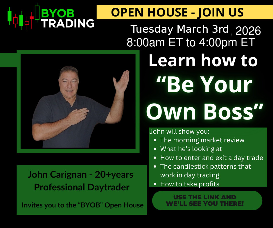 Last Call - Register to Attend the BYOB Day Trading Course 3/3 8-4pm Eastern By Admin March 02, 2026 Post a Comment Join John Carignan, a Pro Day Trader for 20+ years for his CRASH COURSE IN DAY TRADING MONDAY & TUESDAY, MARCH 2-3 8am - 4pm Eastern BYOB ("Be Your Own Boss") Day Trading Click Here to Register